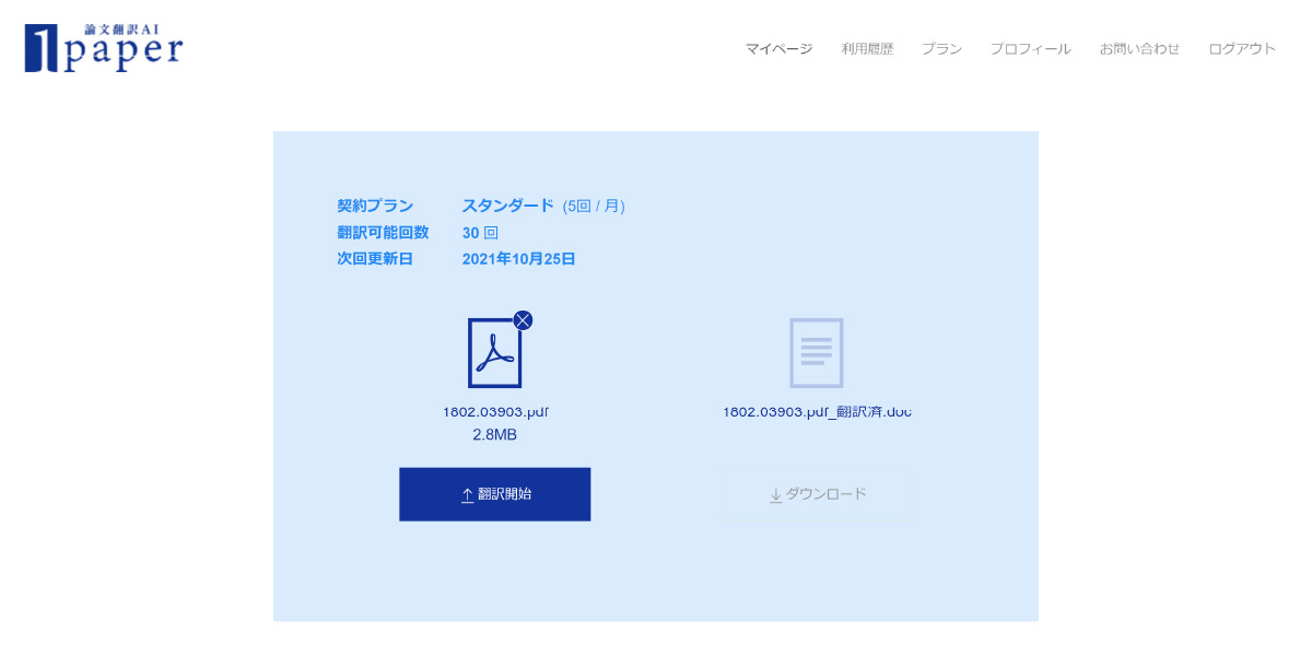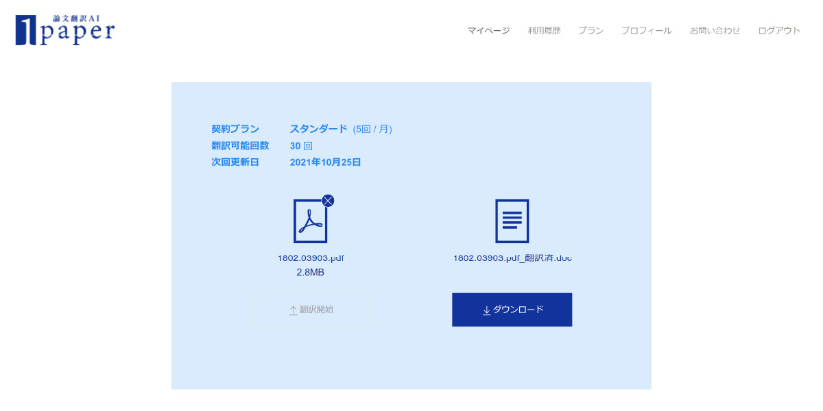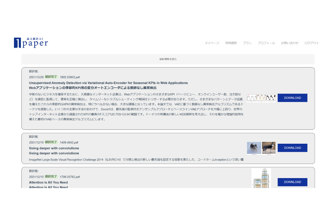 過去に翻訳したファイルは、論文中の代表的な図表とアブストラクトを組み合わせたサムネイルで一覧表示されます。