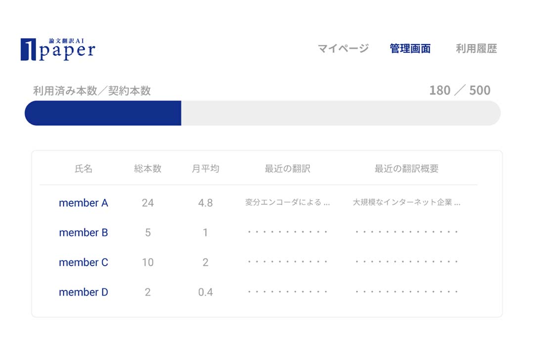 管理画面ではチームメンバーの利用状況や翻訳状況の確認、ユーザー自身の翻訳履歴をすぐに確認できます。